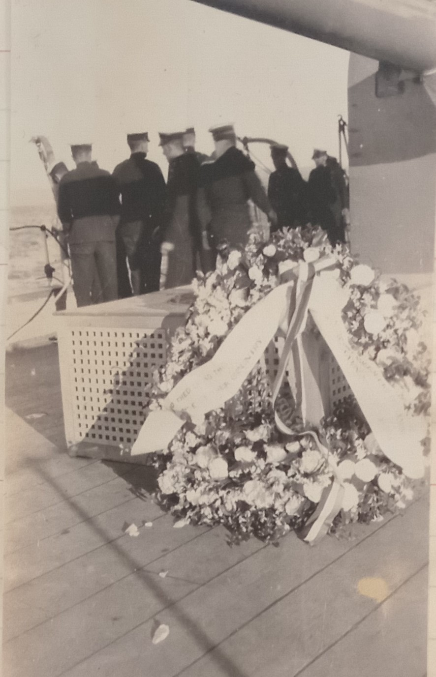 "We dropped three wreathes, two of our own, and one given by the Chilean Navy, I read a special form of service… largely consisting of the Burial Service but it was dark & blowing so we only had one hymn, accompanied by the band." RNM 2015/175/4