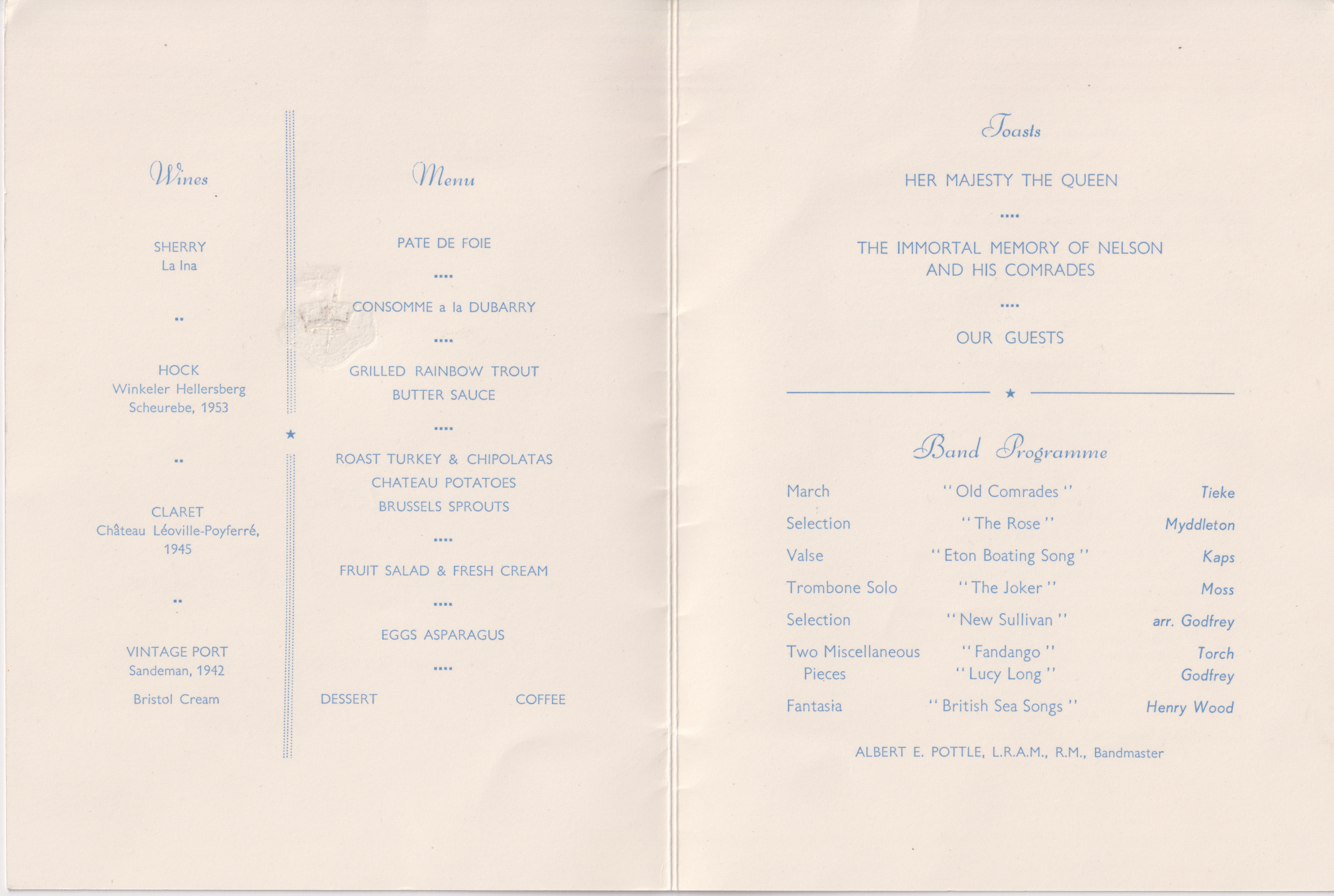 Trafalgar Night Dinners are known for their extravagant menus (as you can see from some of the menus in our collection), and normally consist of three courses. The menu has evolved over the years, though fish is normally served as a starter.